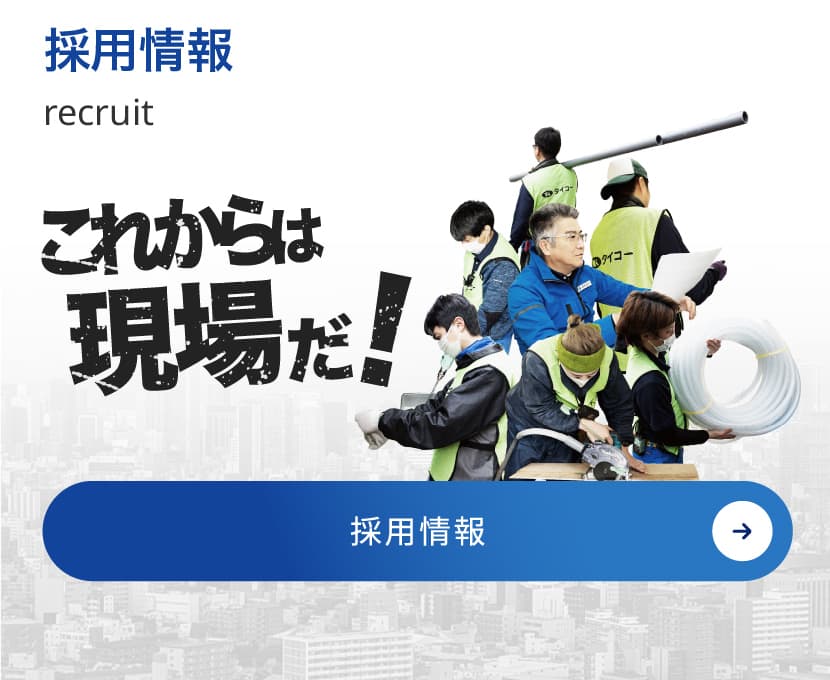 このたび、タイコーHD株式会社のホームページを新たに公開いたしました。タイコーグループは、「断らない」を貫き、マンション・集合住宅の給排水設備に関するあらゆるお困りごとに対応してまいりました。給水管・給湯管・排水管の更生 […] -