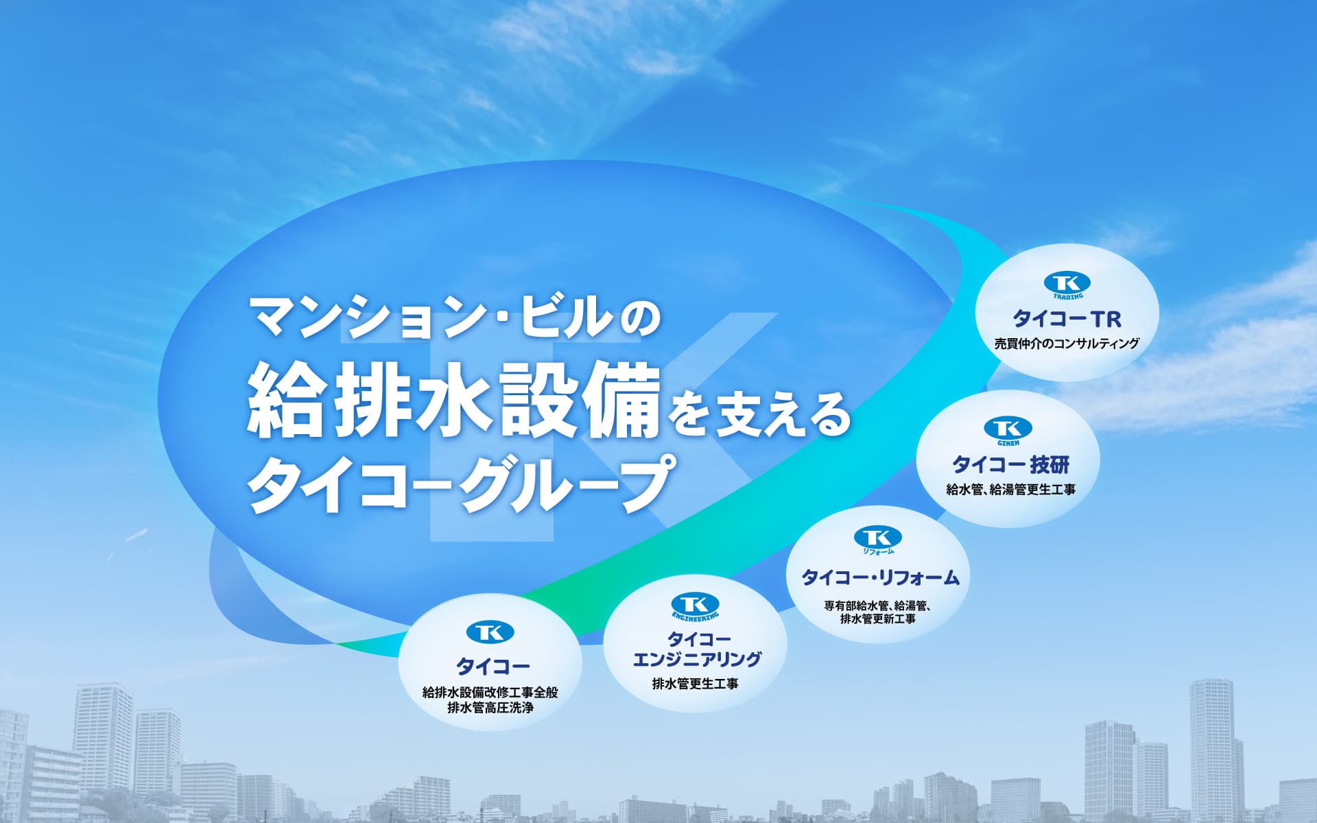 タイコーグループは、更生・更新・洗浄・緊急対応など各分野の専門会社で構成。それぞれの専門知識を結集し、部分的な対応ではなく、建物全体を見据えた総合的なご提案が可能です。