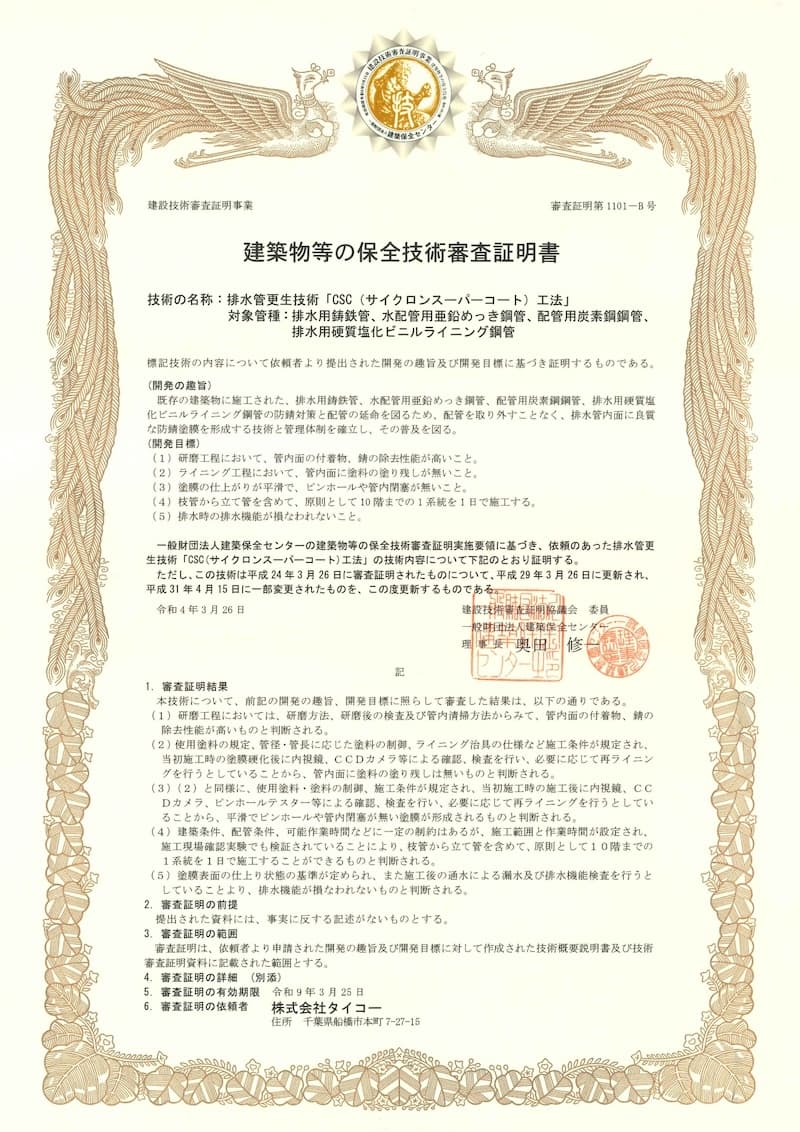 CSC工法(財)建築保全センター 審査証明第1101-B号 取得