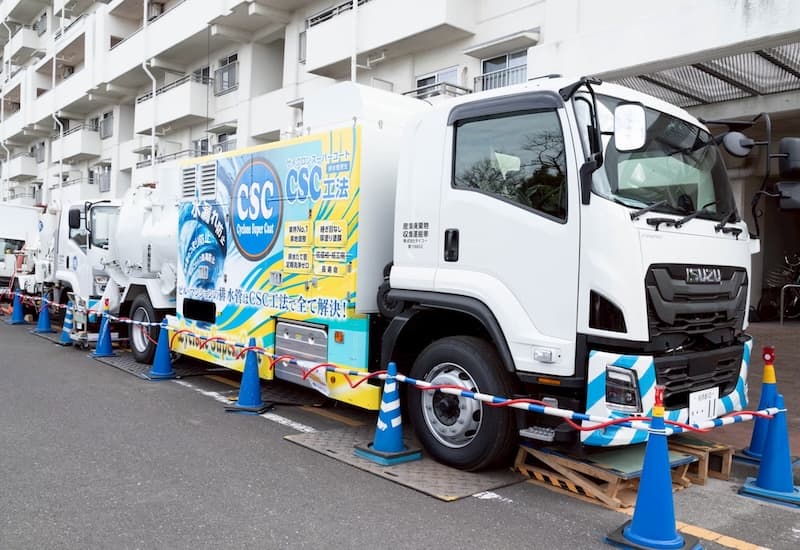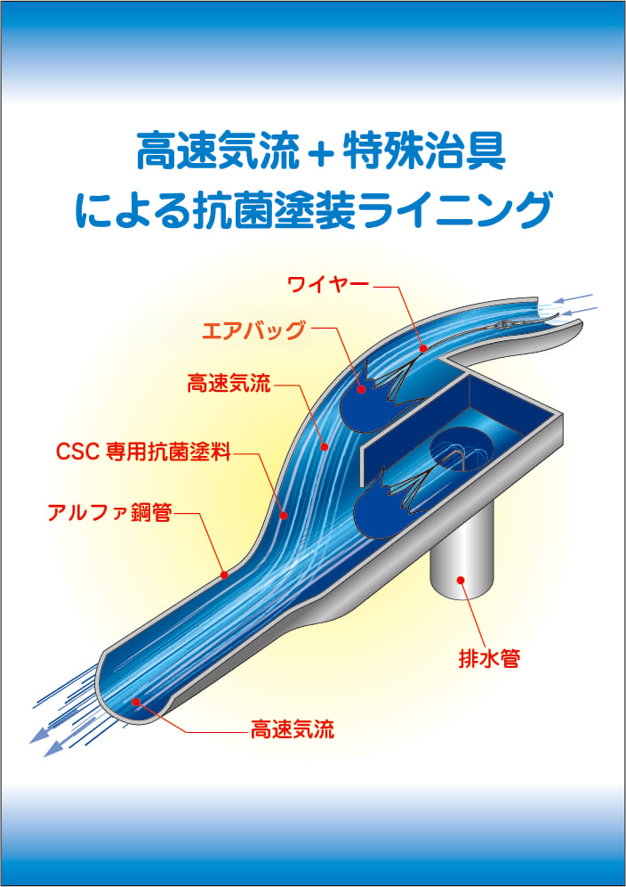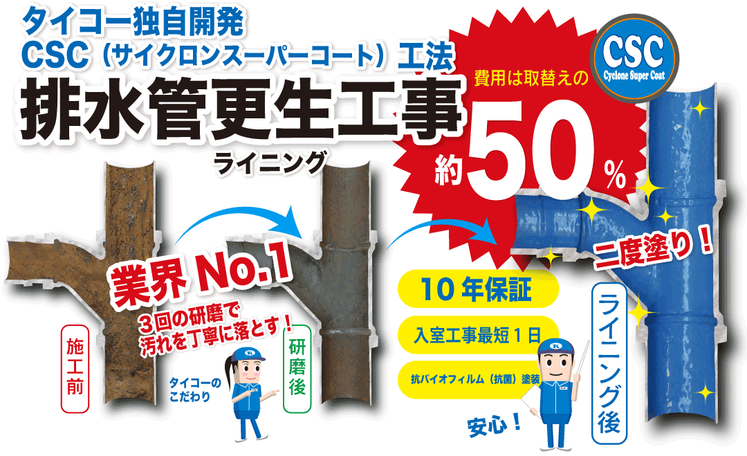 タイコーでは、排水管更生(ライニング)工事では、独自開発のCSC工法で施工いたします。