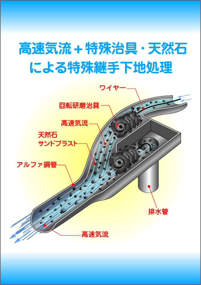 | 分岐部・継手の処理 | 分岐部・横管・集合継手も継ぎ目なく連続コーティング。管全体が一体化 |