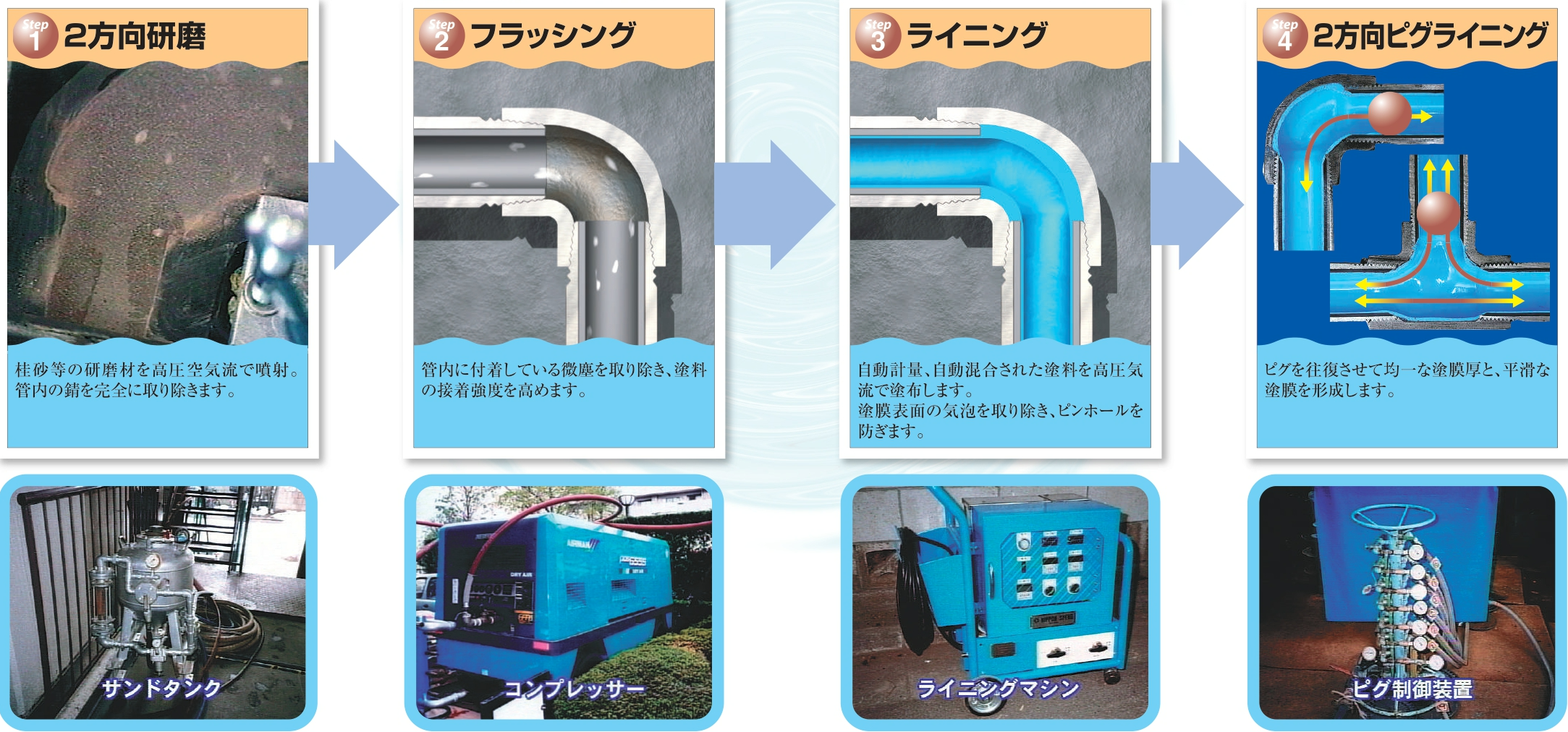 NPBⅢ工法をさらに改良した工法です。塗布工程後に加熱養生(加圧温風養生・加圧温水養生)を行い、施工当日に通水可能な塗膜硬度を発現。断水時間を最小限に抑えたい現場に最適です。