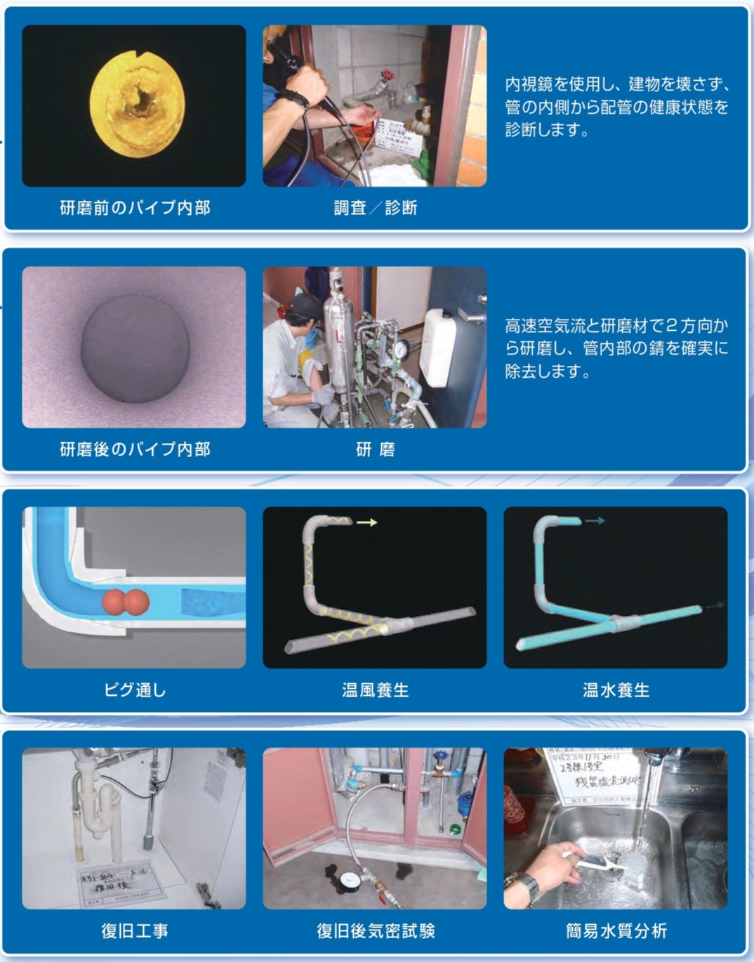 塗膜検査・通水試験を実施し、品質を確認。施工報告書をお渡しし、10年保証をスタートします。