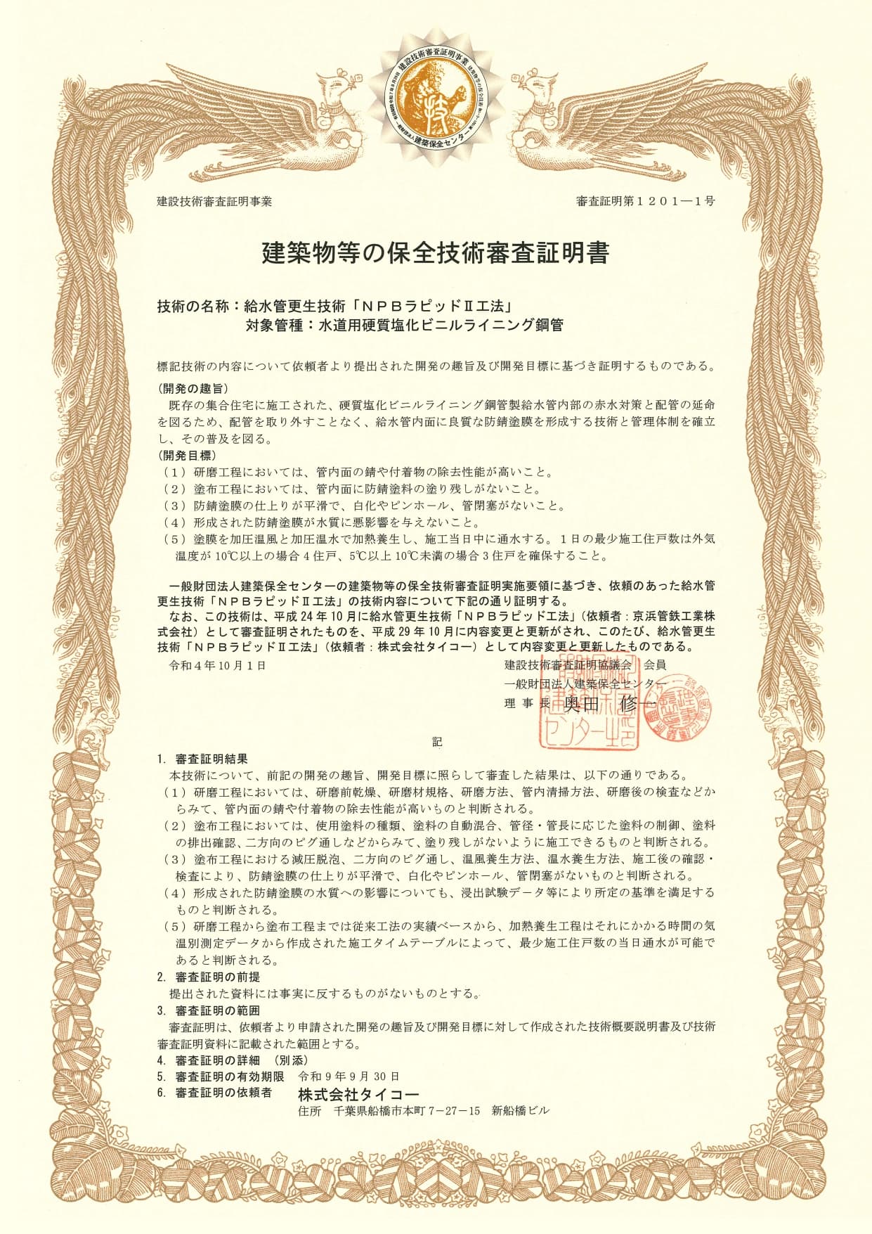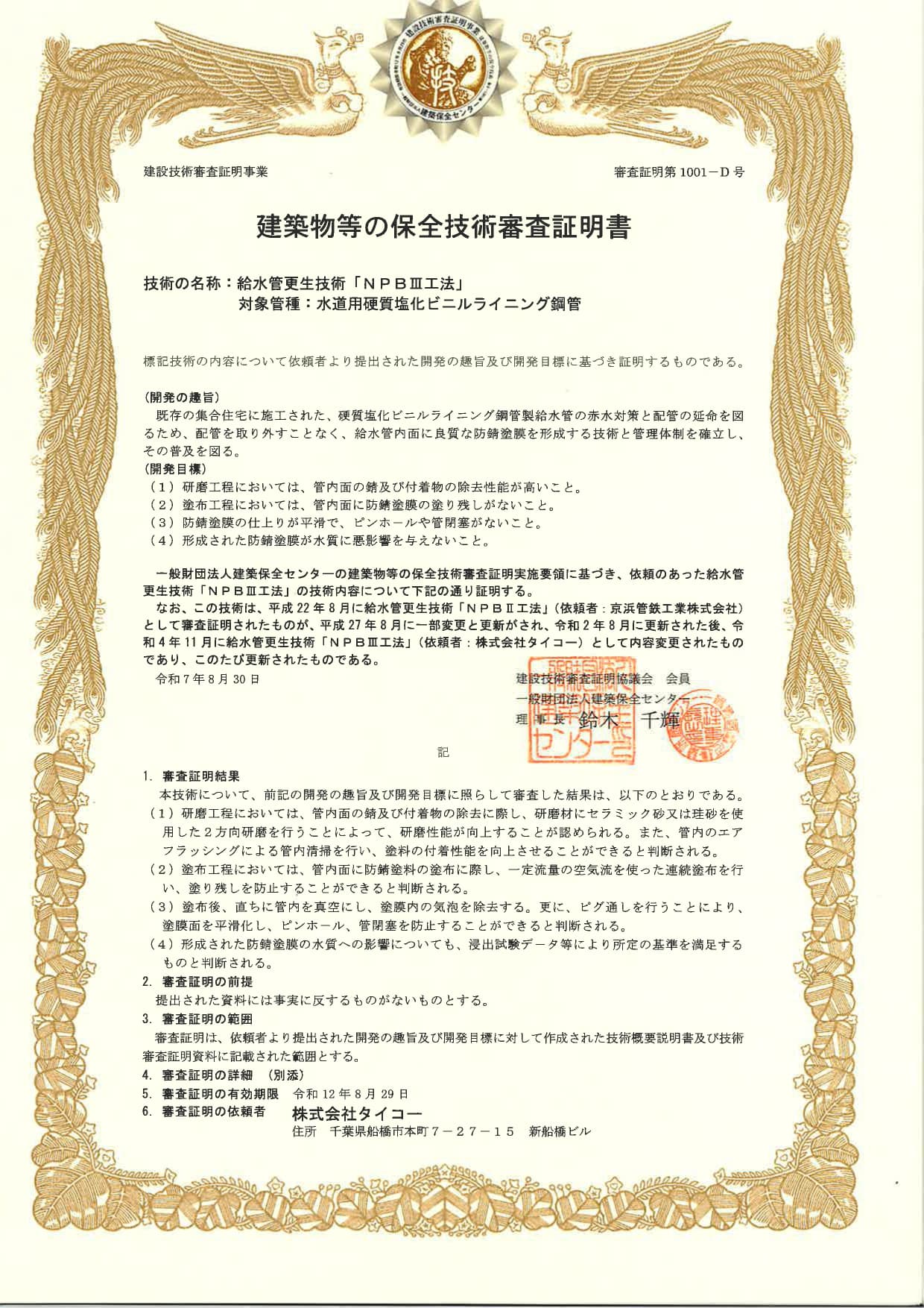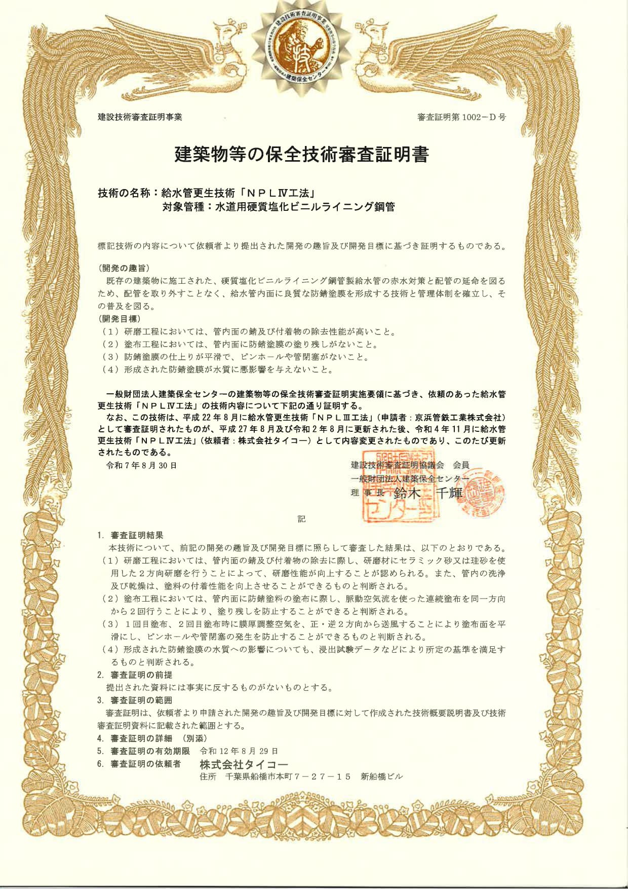 タイコーは給水管更生工法の工法元として、第三者機関(一般財団法人 日本建築センター)の技術審査証明を取得。